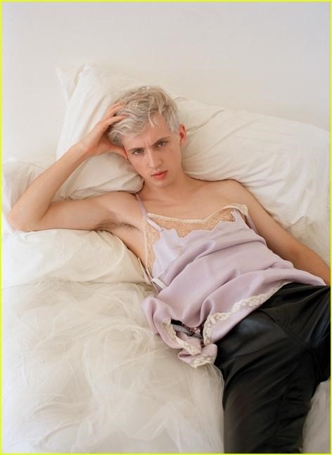 Attention to his physical appearance dominates discourse about Sivan. In photos, Sivan’s body is frequently positioned in reclined, open positions that feminist media scholars like Jean Kilbourne identify as the stuff of misogyny: bodies shot from above, posed on beds or on the floor, legs spread, inviting the gaze of men, in child-like poses, often infantilized, subjected to dehumanizing violence, and at the same time hypersexualized and always available for sex. Similar images and body positions dominate gay male erotica and pornography, especially in depictions of youthful and inexperienced men (so-called twinks). Journalists frequently remark on Sivan’s “prettiness” and fawn over his flawless, alabaster complexion, which, according to Dazed, “is enough to make you swoon.” Wonderland magazine makes cherubic connections in this video from a 2018 photoshoot. When directed at women, such comments raise the ire of feminist fans and critics who believe that women should be judged by their work and character, not their appearance. Not so for LGBTQ celebrities. While queer activists also promote self-love and discourage body shaming, it’s also routine for journalists and public figures themselves to discuss the importance of beauty, fierceness, and flawlessness as part of twenty-first century queer visibility. This reveals a tension between feminist and queer discourse—and one that this essay will certainly not resolve. That Troye is a cis-male and gay means that he can, in a sense, have his cake and eat it, too. He’s taken seriously in the pop world as a musical force and his “prettiness” serves as an asset.