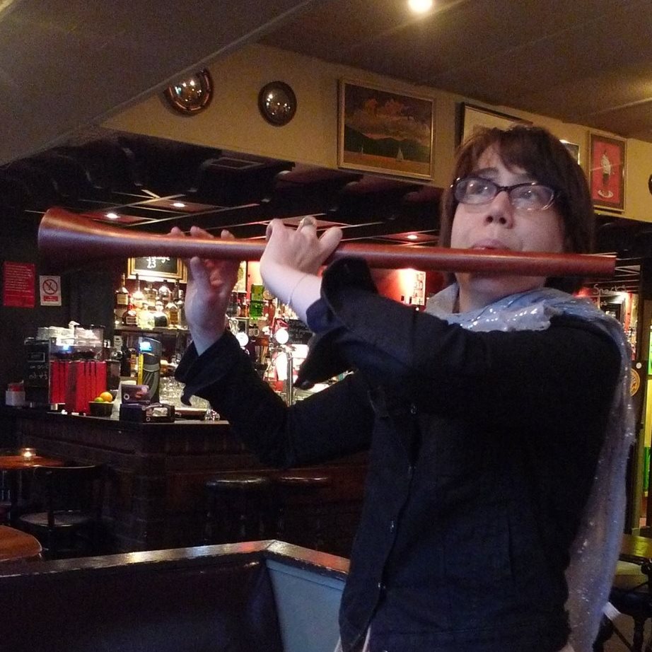 Elizabeth Ford has a Ph.D. in music from the University of Glasgow (2016) and her dissertation won the National Flute Association Graduate Research Competition. Her work looks at the history of the flute in Scotland, Scottishness, performance practice, and pedagogical history. Her edition of William McGibbon’s complete sonatas has been accepted for publication by A-R Editions. She is the English language editor for Schott Music’s online texts, and co-research assistant on the Royal Society of Edinburgh-funded Eighteenth-century Arts Education Research Network (EAERN). She was recently awarded a fellowship from the Handel Institute to work on an edition of the flute compositions of James Oswald. The picture shows her in a pub with a reproduction of the unique bell-ended flute from the ceiling of Crathes Castle, Aberdeenshire, c. 1599. She likes to call it The Blunderbus.