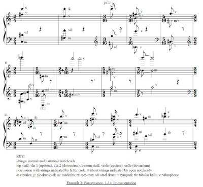 Despite its richly connected surface, this opening music moves through a dizzying array of close or distant sonorities with no regular pulse beyond a constant pushing and pulling of chordal interactions. There is no single organizing reference, no textural center. Borrowing a term from William Caplin, we can refer to this music as manifesting ‘loose’ organization. His term becomes even more useful when we discover, later in the composition, the music suddenly aligning into a contrasting, ‘tight-knit’ pattern that features a dialogue in the style of a frieze pattern between alternating marimba duo and string quartet, about an insistent, refrain-like figure in the vibraphone.<10> The second such passage is shown on example 3. The intervals in the refrain seem responsive to the intervallic content of the duo and quartet, suggesting that a “root interval” may be derived from a process of distillation. At core, such a context allows us yet another format in which to experience the affinities at the heart of paregmenon; the anxieties of an unfamiliar terrain have given way to a sense of wonder at its fragile beauty.