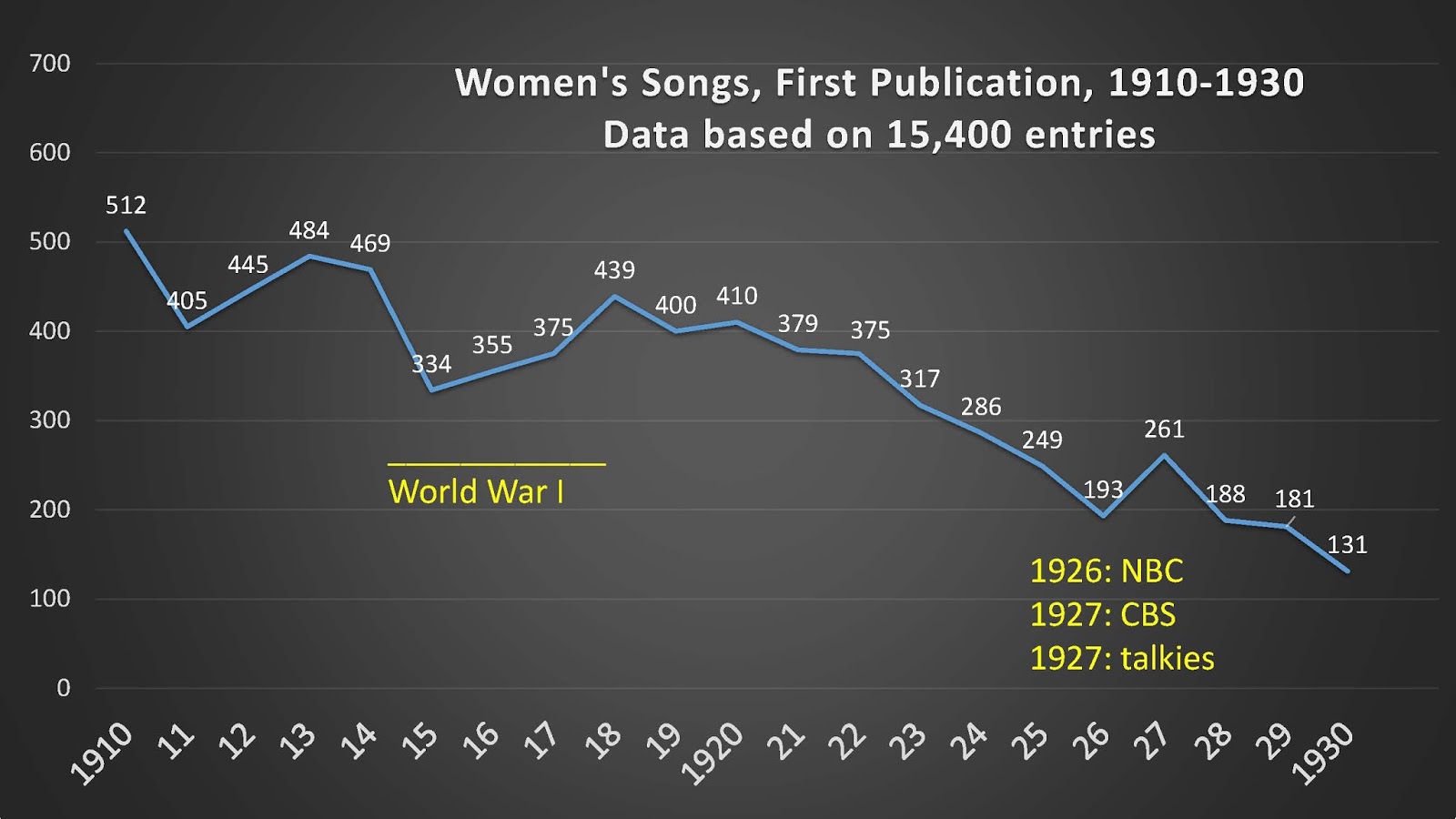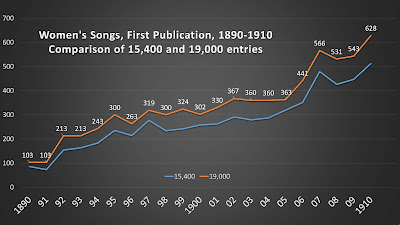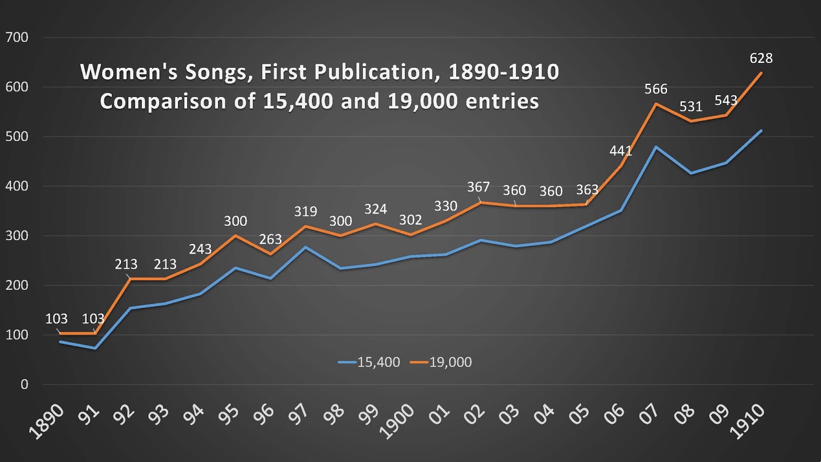 Women published 103 new songs in 1890 and 1891 and then ascended even more dramatically to 628 in 1910. Similarly, the additional data show the decline in the 1920s as still more pronounced.
