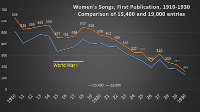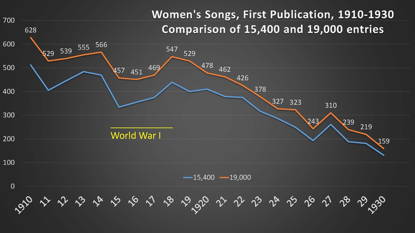 More significantly, the database makes it possible to chart the dramatic rise and fall of women song writers that occurred during these decades. Two years ago the figures resulted in the following trajectory.