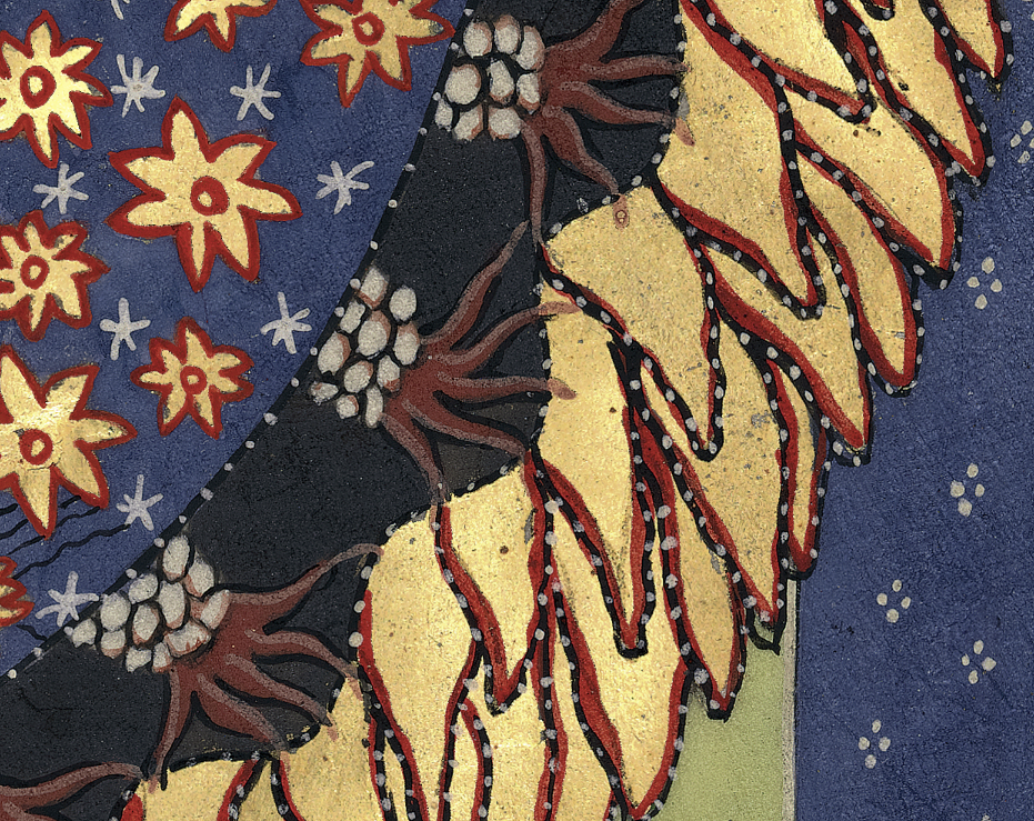 We are now creating various test models of the fiery shell of the universe, and you will see some at the AMS lecture, with appropriate music. The image of the cosmic egg from Scivias I.iii circulates widely on the internet. But because we have the high-resolution photographs, lent by the nuns of Eibingen, who retain the rights to them and who own the original manuscript, we are able to incorporate details that would otherwise not be available. The images below are, first, from the internet, and, second, a blowup of the edge of the image in high resolution.