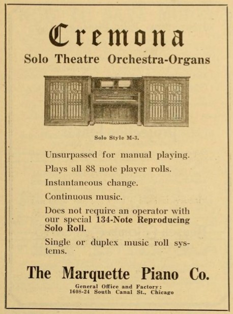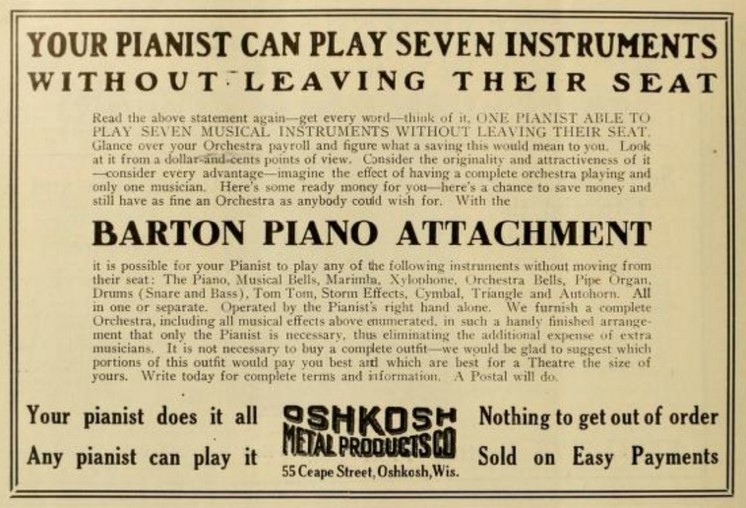 In selling mechanical instruments to motion picture houses, advertisers often emphasized the instruments’ practicality. In other words, selling the mechanical instrument to motion picture houses required less delicacy regarding labor reduction, perhaps because the labor saved is male labor, and perhaps because the dollars-and-cents of the theater as a business made such talk less crude.