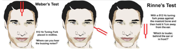 | Rinne test and Weber test. Image from http://www.clinicaljunior.com/enttuningforktests.html |