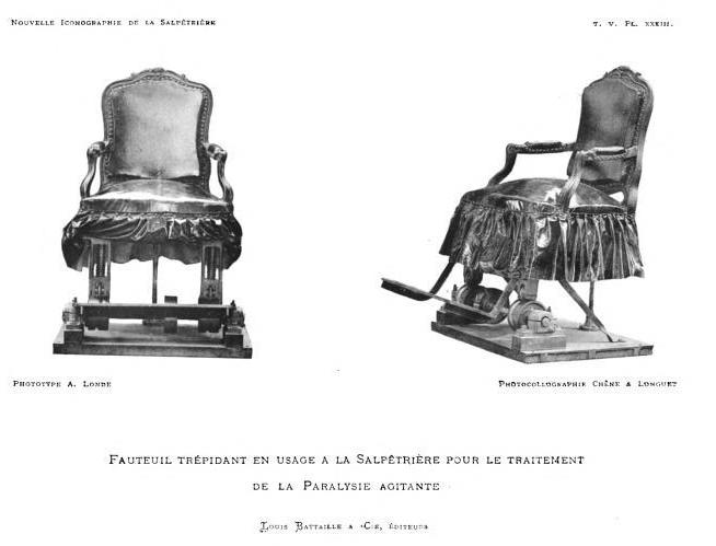 | Charcot’s vibrating chair. Image from Nouvelle iconographie de la Salpêtrière, Vol. 5, 270b. |