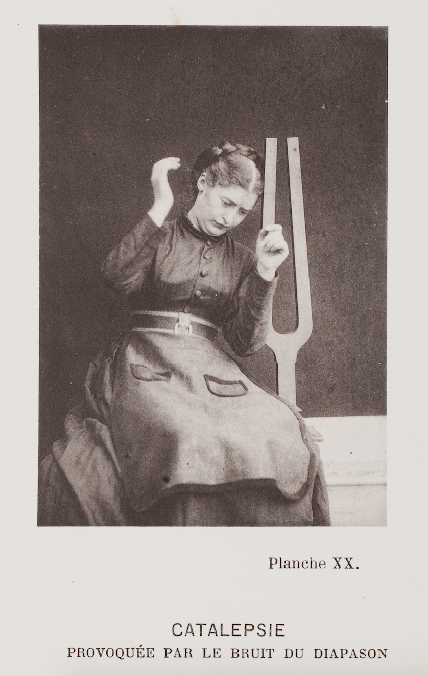 One intriguing image stands out among the many unusual photographs in Désiré-Magloire Bourneville and Paul Régnard’s Iconographie photographique de la Salpêtrière (1876-80). A woman sits next to an immense tuning fork, her neatly coiffed head tilted to one side and an expression of deep concentration on her face. The sheer size of the fork is astonishing, as is the claim that the image depicts “catalepsy provoked by the sound of a tuning fork.” I interpret this image as a literal snapshot of the idea that specific kinds of sound had privileged access to the nerves, a motif that haunts the long nineteenth century and continues to resonate into the present day.