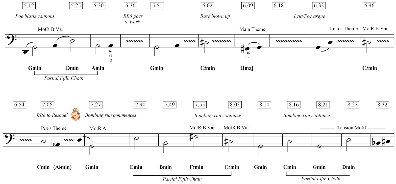 The First Order’s surprise attack on the Resistance nicely illustrates a melodic motif can evolve into a harmonic one. The excerpt shown below in reduction is melodically related to the MoTR’s melodic basic idea (and anticipates a powerful new “Desperation” motif), and its underlying tonal scheme alludes to the fugato. The initial fifth motion [Bm→F#m] doesn’t go far, but a chromatic adjustment then commences a climb from Fm to Cm to Gm and (with a partially elided Dm) eventually lands on Am, when all hell really breaks loose.