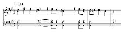 The tempo is an unrelenting, brisk QN = 155. Though the unrepeated 9-bar introduction is in common time, the other 90% of the work is in triple meter. This triple meter helps propel the cue and player forward with its strong upbeat-into-downbeat 3|1 (and its variants 3+|1 and +|1) feel. Melodically, Sakimoto encourages this forward propulsion with frequent pickups in the melody or +3+|1 gestures as in the B theme (see below).