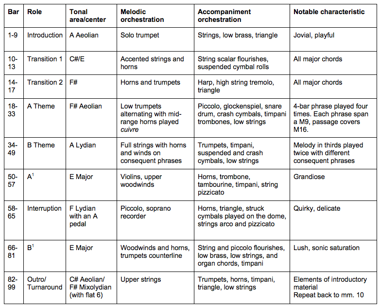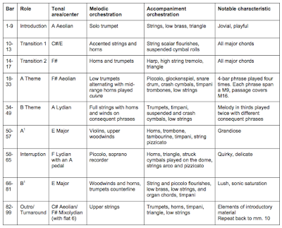 The introduction features an A Aeolian melody in trumpet with frequent pick-ups into or ties over the next bar. It’s playful, whimsical even with its 3-bar opening phrase and then its 2-bars of 2 different consequent answers. The orchestration, tonality, and meter changes, dramatically shift in the transition to triple meter in C-sharp and with a two-bar sequence upward by minor third, set for low, accented strings and horns. Third and sixth relationships will be common throughout the cue. It is as if the player’s world just grew by leaps and bounds. While continuing this transition for four additional bars, Sakimoto changes the orchestration midway, shifting the string to a high tremolo, with harp and horns left to dominate. This transition sets up an occasionally inflected F-sharp Aeolian of the cue’s A theme.