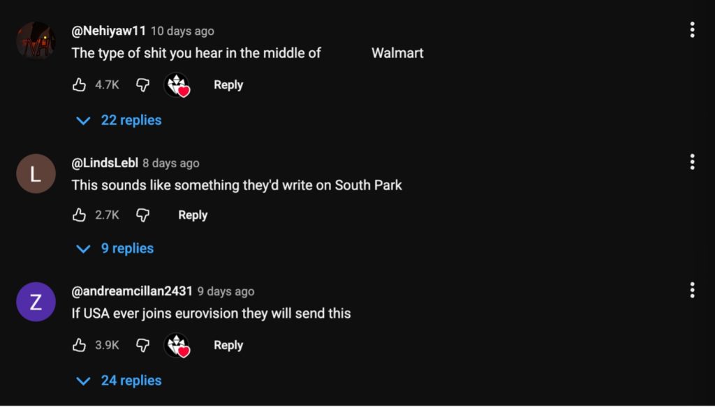 Screenshot of YouTube comments that frame “We Are Charlie Kirk” as ironic meme audio through comparisons to Walmart, South Park, and Eurovision, evidencing the collapse of reverence into ridicule in social media reception.