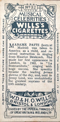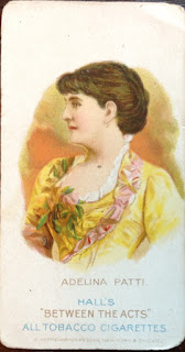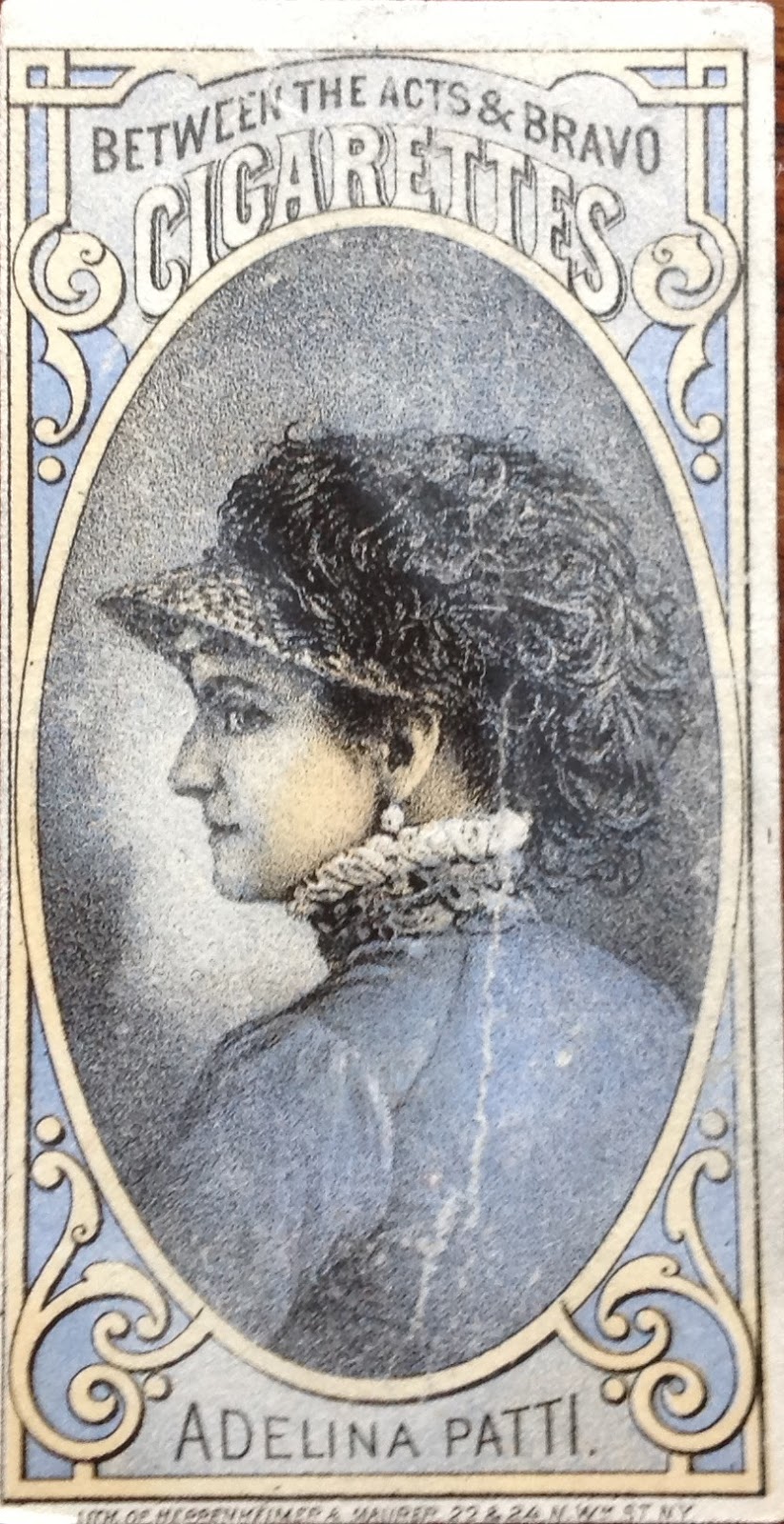 Patti was active prior to the time when cigarette companies had begun their aggressive advertising campaigns; nevertheless, her image was employed to sell tobacco products. As far as I can tell, her association with the tobacco industry was limited to one form of marketing: cigarette cards, small pieces of cardboard that were once used to strengthen flimsy paper packaging. Beginning around 1875, manufacturers transformed these items of necessity into advertising tools, printing the name of the cigarette brand prominently on the cards next to or above images of famous personalities; on the reverse side, interesting facts regarding the celebrities’ lives and careers sometimes appeared. These cards became collectors’ items, much like baseball cards, and it is possible to find examples featuring singers such as Jenny Lind, Mary Garden, Geraldine Farrar, Christine Nilsson, and many others. Patti’s image appears on at least five cigarette cards that I have been able to identify and there are undoubtedly more out there waiting to be discovered.